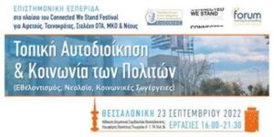 Το πολυθεματικό φεστιβάλ Connected We Stand Festival (μια συνδιοργάνωση των ΧΑΝΘ, ΑΜΚΕ ΙΑΣΙΣ, Actionaid, InfinityGreece, ESN Thessaloniki, ΕΨΥΚΑ, AddArt) η Πανελλήνια Ένωση Γενικών Γραμματέων Τοπικής Αυτοδιοίκησης ‘Κλεισθένης’ & η International Forum Training & Consulting, μας προσκαλούν να συμμετέχουμε στην Επιστημονική Εσπερίδα που θα υλοποιηθεί την Παρασκευή 23 Σεπτεμβρίου 2022, στην Θεσσαλονίκη με θεματική «ΤΟΠΙΚΗ ΑΥΤΟΔΙΟΙΚΗΣΗ & ΚΟΙΝΩΝΙΑ ΤΩΝ ΠΟΛΙΤΩΝ», στον άξονα της οποίας πρόκειται να πραγματοποιηθούν ομιλίες εκπροσώπων θεσμικών φορέων, Ο.Τ.Α. και οργανώσεων της Κοινωνίας των Πολιτών γύρω από τον εθελοντισμό σε καταστάσεις κρίσης, το ευρωπαϊκό μοντέλο ζωής, το σχεδιασμό και υλοποίηση δράσεων με στόχο την κινητοποίηση της νεολαίας καθώς και παρουσίαση καλών πρακτικών ή δυνητικών συνεργασιών ανάμεσα σε Ο.Τ.Α. και φορείς της Κ.τ.Π. με κοινωνικό και περιβαλλοντικό χαρακτήρα.