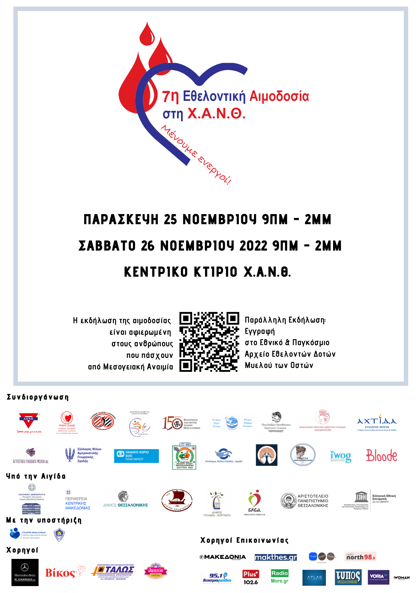 Την Παρασκευή 25 και το Σάββατο 26 Νοεμβρίου 2022 προγραμματίζεται στις εγκαταστάσεις της Χ.Α.Ν.Θ. η «7η Εθελοντική Αιμοδοσία στη Χ.Α.Ν.Θ» σε συνδιοργάνωση 18 κοινωνικών φορέων: Χ.Α.Ν.Θ., Πηγή Ζωής, Ελληνικός Σύλλογος Θαλασσαιμίας, Φιλόπτωχος Αδελφότης Κυριών Θεσσαλονίκης, Φιλόπτωχος Αδελφότης Ανδρών Θεσσαλονίκης, Γυναίκες Χωρίς Σύνορα, ΠΠΟΓ Θερμαΐδες, ΠΑΣΓ Καλλιπάτειρα (Παράρτημα Θεσσαλονίκης), Αχτίδα, Αγροτική Παιδική Φωλιά ΒΕ, Σύλλογος Φίλων Αμερικανικής Γεωργικής Σχολής, Παιδικό Χωριό SOS Πλαγιαρίου, ΠΡΟ.Τ.Ε.Κ.Τ.Α. Θεσσαλονίκης, Σύνδεσμος Φιλίας Ελλάδας – Ισραήλ, IWOG (International Women’s Organization of Greece) RED-Y, Υπατία – Λέσχη Lions Θεσσαλονίκης, Bloode.