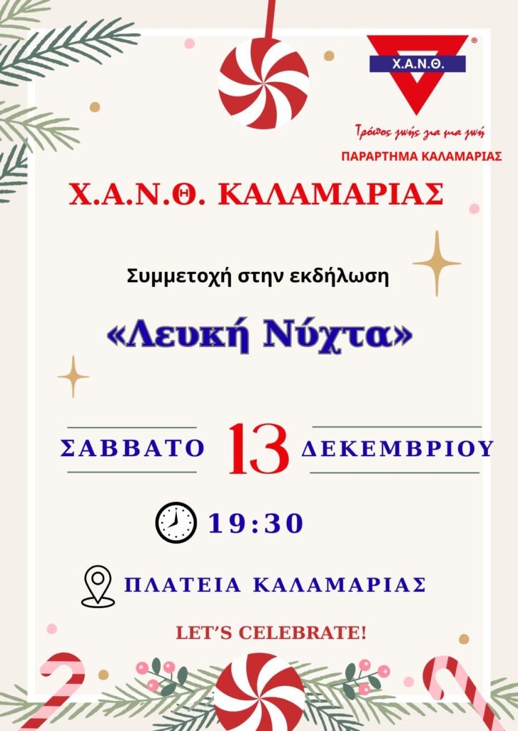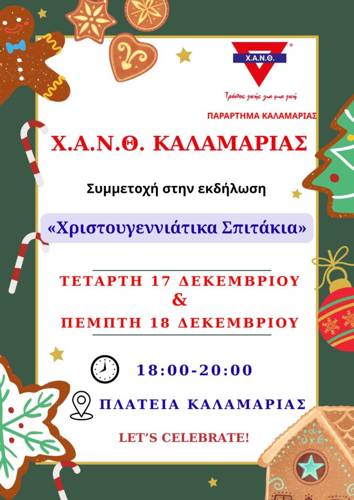 Η Χ.Α.Ν.Θ. Καλαμαριάς θα συμμετέχει στις χριστουγεννιάτικες εκδηλώσεις του Δήμου Καλαμαριάς, με παρουσία τόσο στη «Λευκή Νύχτα» του Σαββάτου 13 Δεκεμβρίου όσο και στα «Χριστουγεννιάτικα Σπιτάκια» της Τετάρτης 17 Δεκεμβρίου στην Πλατεία Δημαρχείου.