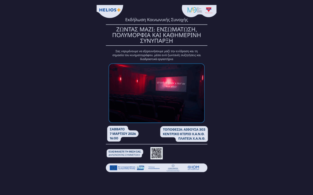 Στο πλαίσιο του προγράμματος HELIOS+, το Κέντρο Helios+ της Χ.Α.Ν.Θ. διοργανώνει την τρίτη Δράση Κοινωνικής Συνοχής, προσκαλώντας ωφελούμενους και μέλη της κοινότητας σε μια κοινή κινηματογραφική εμπειρία.