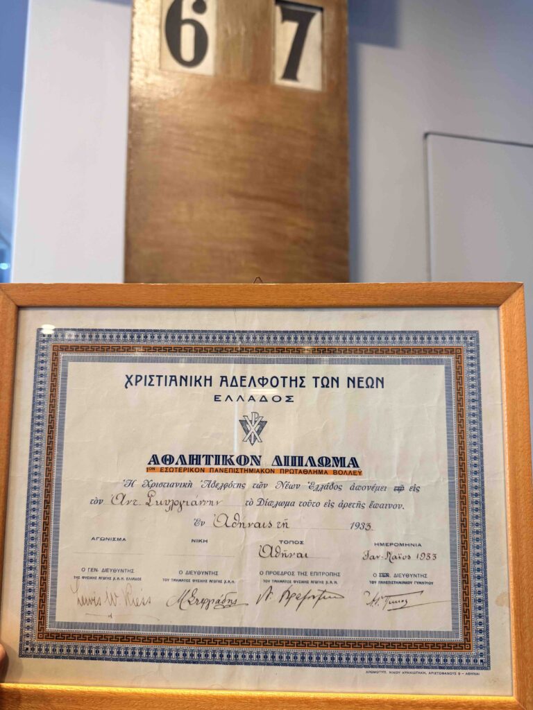 Επίσης κι ένα δίπλωμα που του απονεμήθηκε το 1933 από την Χ.Α.Ν. για την συμμετοχή του στο «εσωτερικό πανεπιστημιακό πρωτάθλημα βόλεϊ» το οποίο μεταξύ άλλων έχει την υπογραφή του τότε Γενικού Διευθυντή των Χ.Α.Ν. Λιούις Ρης.