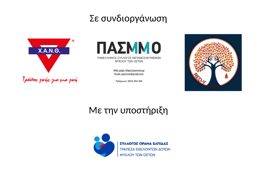 H Χ.Α.Ν.Θ., ο Πανελλήνιος Σύλλογος Μεταμοσχευμένων Μυελού των Οστών – ΠΑΣΜΜΟ, το σωματείο RED-Y, με την συνδρομή και υποστήριξη του Εθνικού Οργανισμού Μεταμοσχεύσεων – ΕΟΜ και με την υποστήριξη του Συλλόγου Όραμα Ελπίδας συνδιοργανώνουν την Τρίτη 21 Ιουνίου από τις 10:00 έως τις 20:00 ενημέρωση για τη δωρεά μυελού των οστών στις εγκαταστάσεις της Χ.Α.Ν.Θ. (ιστορικό κτίριο).