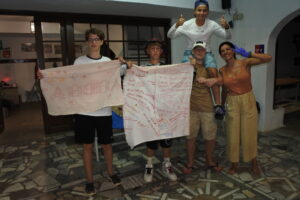 Όταν τελείωνε το κάθε παιδί την δημιουργία του, έβγαινε μια ατομική φωτογραφία και έδινε το έργο του στην συντονίστρια να την κολλήσει πάνω στην σκηνή ώστε να γίνει το κολλάζ. Η δημιουργικότητα των παιδιών ήταν εντυπωσιακή. Εξέφρασαν τα συναισθήματα τους με έναν τρόπο τόσο πηγαίο. Άλλα έδειξαν την αγάπη τους για την πατρίδα, άλλα για την οικογένεια, άλλα για τους φίλους τους και τους ανθρώπους, άλλα για το κατοικίδιο τους! Μας έδειξαν ποιος είναι ο κόσμος των θαυμάτων για τα παιδιά. Ένας κόσμος με αγάπη για τα ιδανικά. Την οικογένεια, τη φύση, την πατρίδα…τον άνθρωπο. Με λίγα χρώματα και ένα κομμάτι ύφασμα, απάντησαν σε αυτό το μεγάλο ερώτημα. Ποιο είναι το θαύμα της ζωής; Τί κάνει τον κόσμο θαυμαστό; Η δική τους απάντηση κάλυψε μια σκηνή η οποία το επόμενο πρωί τοποθετήθηκε σε κεντρικό σημείο της κατασκήνωσης. Εκεί ζητήθηκε από τα παιδιά να μπαίνουν στην σκηνή και να γράφουν σε ένα κομμάτι χαρτόνι το συναίσθημα που τους έμεινε από αυτή της δράση και να το ρίχνουν σε ένα πανέρι. Από αυτά που έγραψαν τα παιδιά αυτό που επήλθε ήταν η συγκίνηση. Ο αποχαιρετισμός ήταν ζεστός…Τα χαιρετίσαμε και ευχηθήκαμε υγεία και καλή αντάμωση. Η δράση ολοκληρώθηκε αφού στάλθηκε στα παιδιά ένα άλμπουμ με τις φωτογραφίες τους και τα έργα τους ως ανάμνηση από το δημιουργικό καλοκαίρι τους στην κατασκήνωση της ΧΑΝΘ αλλά και ως υπενθύμιση του παγκόσμιου και πανανθρώπινου μηνύματος που άφησαν στο πανί.