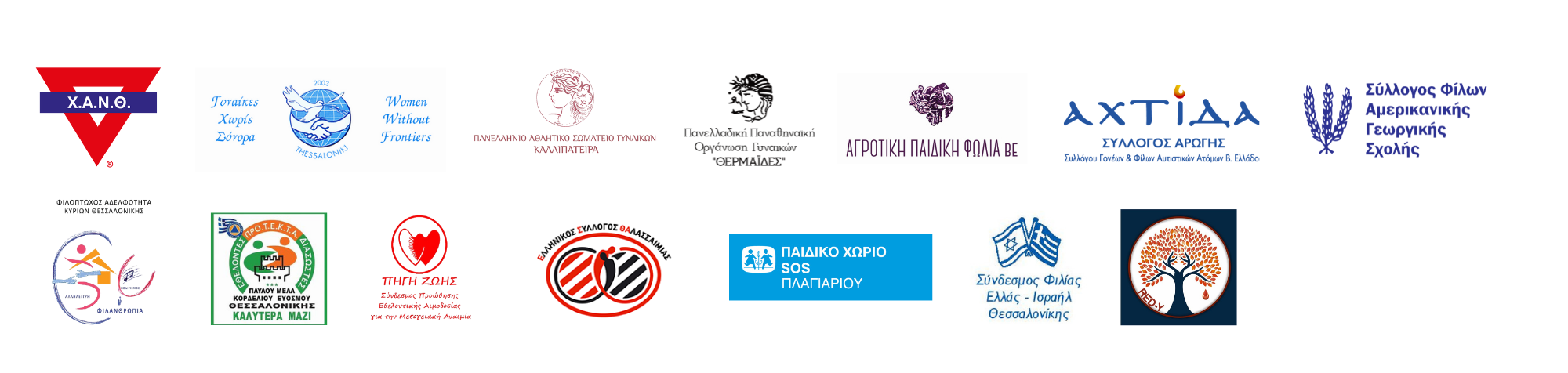 Χ.Α.Ν.Θ., Γυναίκες Χωρίς Σύνορα, ΠΑΣΓ Καλλιπάτειρα (Παράρτημα Θεσσαλονίκης), Θερμαΐδες, Αγροτική Παιδική Φωλιά ΒΕ, Αχτίδα, Σύλλογος Φίλων Αμερικανικής Γεωργικής Σχολής, Φιλόπτωχος Αδελφότης Κυριών, ΠΡΟ.Τ.Ε.Κ.Τ.Α. Θεσσαλονίκης, Πηγή Ζωής, Ελληνικός Σύλλογος Θαλασσαιμίας, Παιδικό Χωριό SOS Πλαγιαρίου, Σύνδεσμος Φιλίας Ελλάδας – Ισραήλ, RED – Y.
