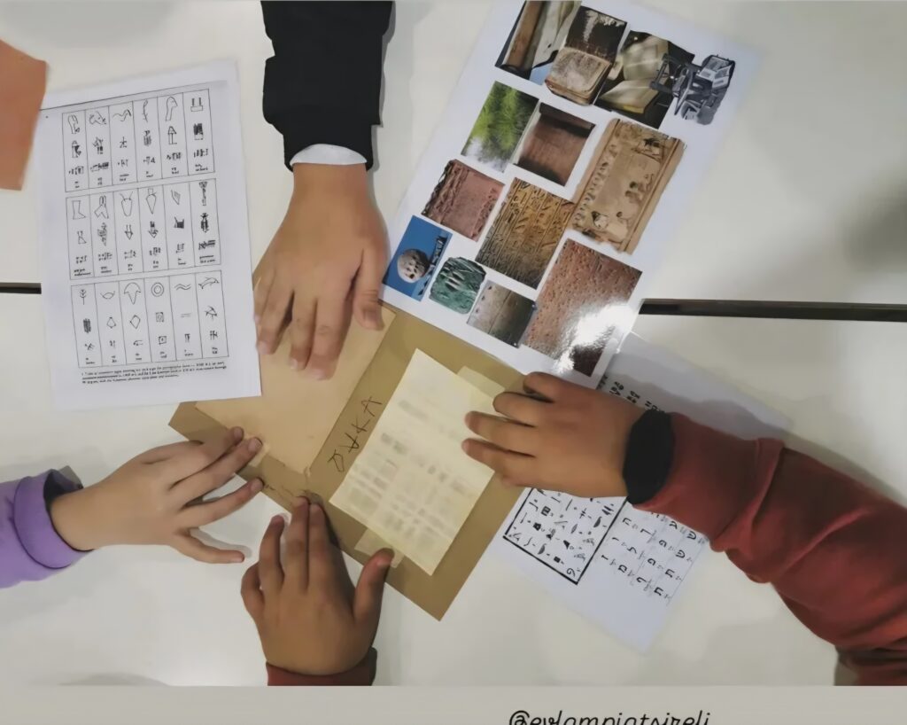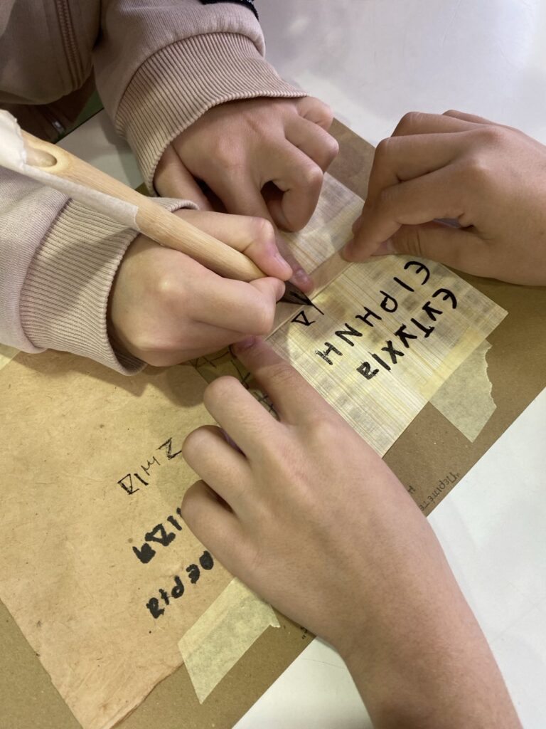 - πειραματίζονται με τα αυθεντικά υλικά γραφής (πηλός, καλάμι, γραφίδα, πάπυρος, περγαμηνή)