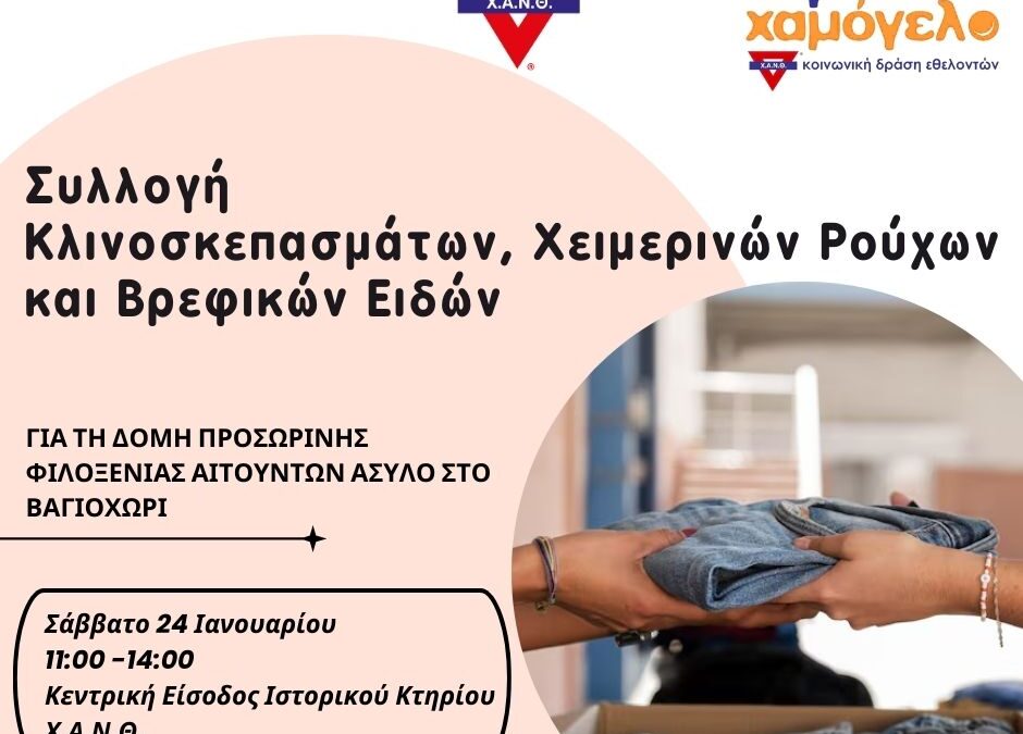 Η Χ.Α.Ν.Θ., σε συνεργασία με τη Δομή Προσωρινής Φιλοξενίας Αιτούντων Άσυλο στο Βαγιοχώρι, διοργανώνει συλλογή ειδών για τους περίπου 500 φιλοξενούμενους της δομής, οικογένειες με μικρά παιδιά. Η δράση θα πραγματοποιηθεί το Σάββατο 24 Ιανουαρίου, από τις 11:00 έως τις 14:00, στην Κεντρική Είσοδο της Χ.Α.Ν.Θ..
