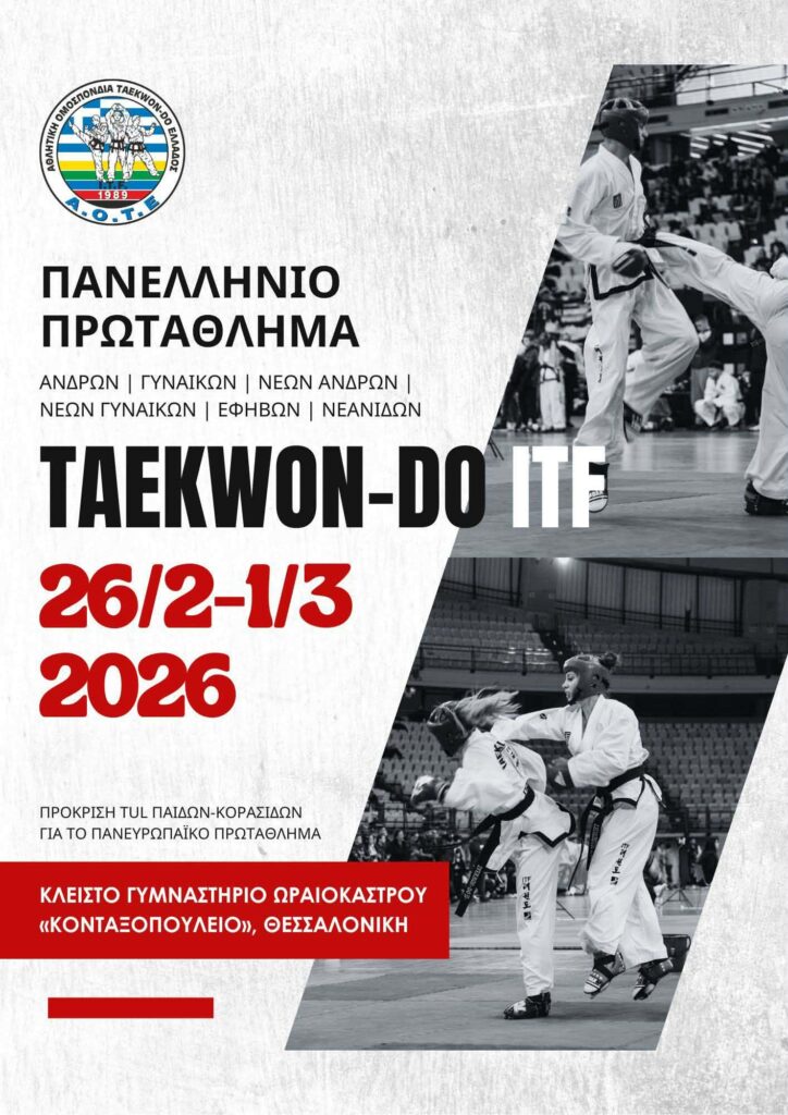 Με δυνατή παρουσία και συγκομιδή μεταλλίων (1 χρυσό, 7 αργυρά και 5 χάλκινα), ολοκληρώθηκε το Πανελλήνιο Πρωτάθλημα Εφήβων/Νεανίδων, Νέων Ανδρών/Νέων Γυναικών και Ανδρών/Γυναικών Taekwon-Do I.T.F. 2026, που διεξήχθη από τις 26 Φεβρουαρίου έως την 1η Μαρτίου 2026 στο Ωραιόκαστρο Θεσσαλονίκης.