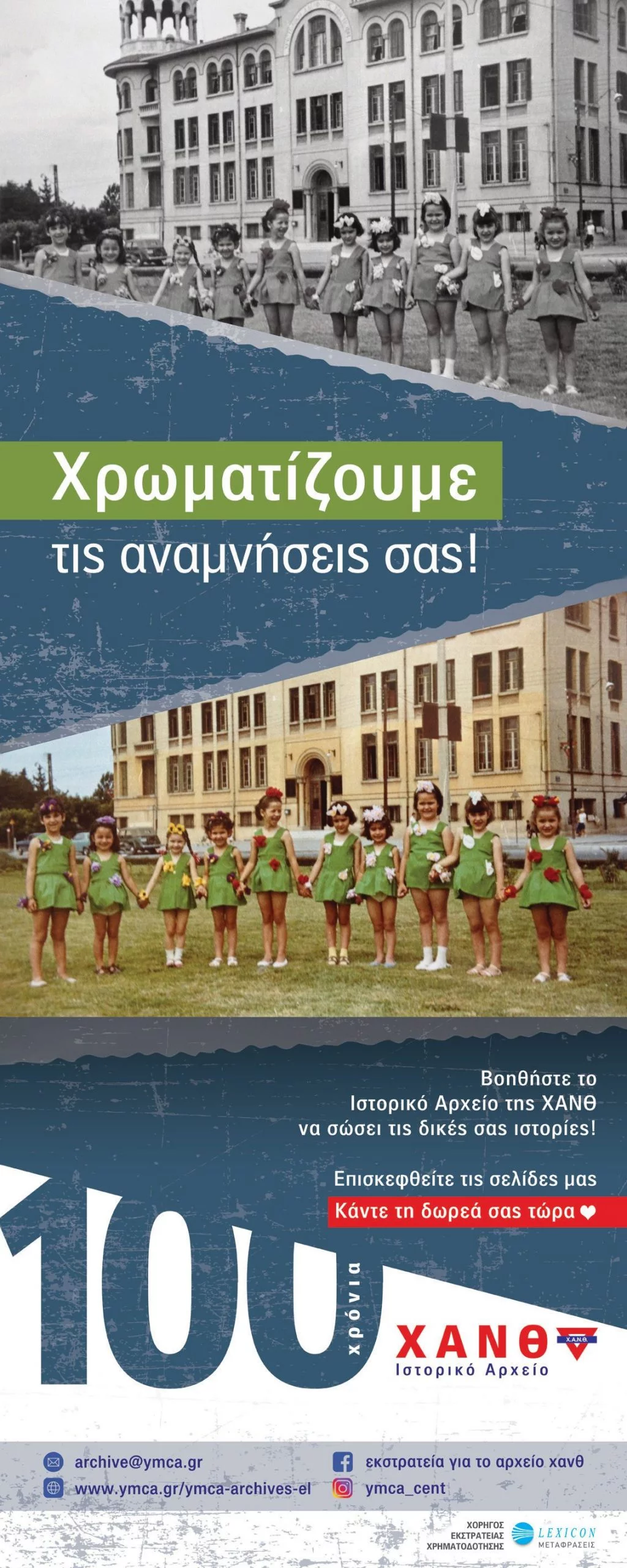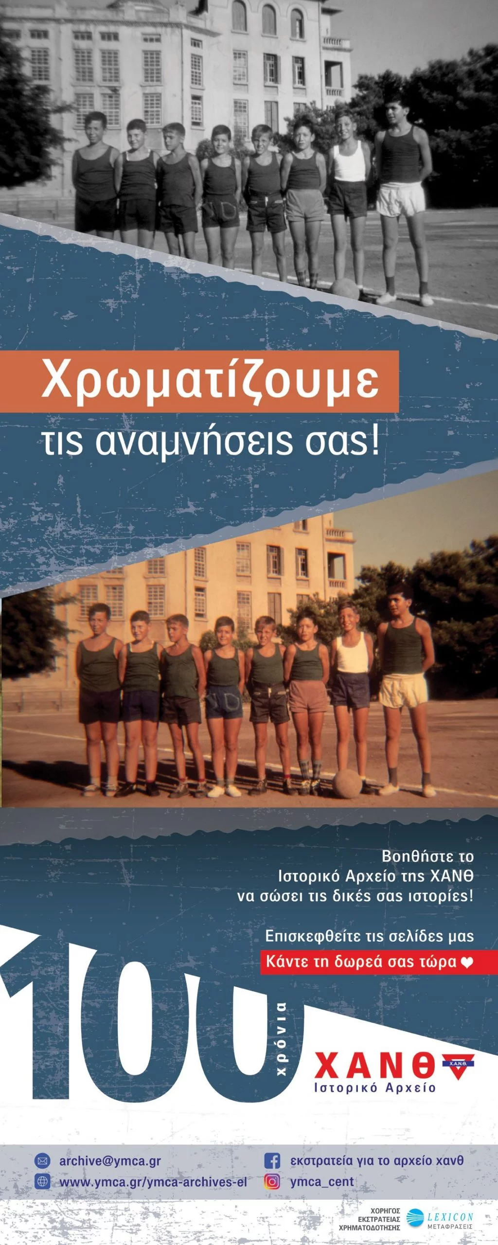 Εάν επιθυμείτε να δωρίσετε στο Ιστορικό Αρχείο της ΧΑΝΘ προσωπικό ή οικογενειακό αρχειακό υλικό σχετικό με τη ΧΑΝΘ (φωτογραφίες, επιστολές, ημερολόγια, αναμνήσεις, παλιές εκδόσεις της ΧΑΝΘ, εκθέσεις και αναφορές, πρακτικά συναντήσεων παλαιών ομίλων, κλπ), είτε στην πρωτότυπη μορφή τους είτε σε ψηφιακά/έντυπα αντίγραφα παρακαλούμε επικοινωνήστε μαζί μας στη διεύθυνση archive@ymca.gr